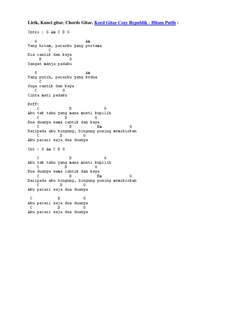 Juga cantik dan kaya. TRIBUNMANADOCOID - Berikut Chord Hitam Putih - Cozy Republic Kunci Gitar G Lirik Lagu yang Hitam Pacarku yang Pertama. The Lyrics for Hitam Putih by Cozy Republic have been translated into 1 languages.